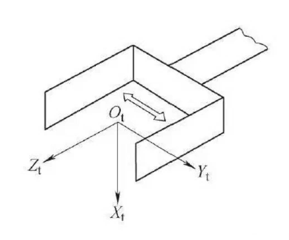 工具坐標(biāo)系以安裝在機(jī)械接口上的末端執(zhí)行器為參照系,符號(hào)為O t、X t、Y t、Z t(見下圖)。原點(diǎn)O t是工具中心點(diǎn)(TCP);+Zt軸與工具有關(guān),通常是工具指向;在平板式夾爪型夾持器夾持時(shí),+Y t是手指運(yùn)動(dòng)平面的方向。
