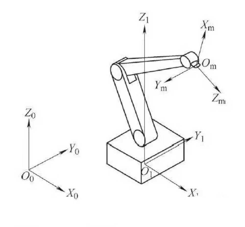 機(jī)械接口坐標(biāo)系是以機(jī)械接口為參照系,符號(hào)為O m、X m、Y m、Z m(見上圖右)。原點(diǎn)O m是機(jī)械接口的中心;+Z m軸的方向垂直于機(jī)械接口中心,并由此指向末端執(zhí)行器;+X m軸由機(jī)械接口平面和X 1、Z 1平面的交線來定義,同時(shí)機(jī)器人的主、副關(guān)節(jié)軸處于運(yùn)動(dòng)范圍的中間位置。當(dāng)機(jī)器人構(gòu)造不能實(shí)現(xiàn)此約定時(shí),應(yīng)由制造廠規(guī)定主關(guān)節(jié)軸位置。+X m軸的指向遠(yuǎn)離Z 1軸。