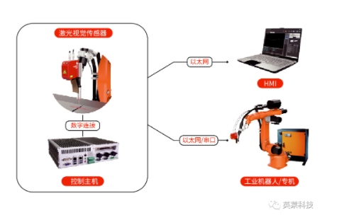 激光視覺焊縫跟蹤系統(tǒng)由焊縫跟蹤傳感器及控制主機(jī)組成,傳感器負(fù)責(zé)焊縫信息的主動采集,控制主機(jī)負(fù)責(zé)焊縫信息的實時處理,并與工業(yè)機(jī)器人或焊接專機(jī)保持實時通訊,讓工業(yè)機(jī)器人或焊接專機(jī)實現(xiàn)焊縫尋位、焊縫實時跟蹤的功能,識別焊縫偏移矯正焊接軌跡,實現(xiàn)真正的智能化焊接。