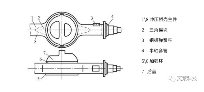 上圖為常見的車橋殼結構,在橋殼眾多焊縫中,橋殼和后蓋、加強環(huán)、半軸套管的環(huán)縫焊接很關鍵。